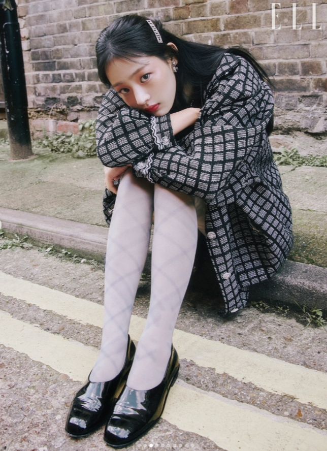 블랙-화이트 컬러의 작은 체크무늬, 그리고 오버핏의 트위드 코트가 민지의 우아하고 성숙한 매력을 더 돋보이게 해주는 것 같습니다.