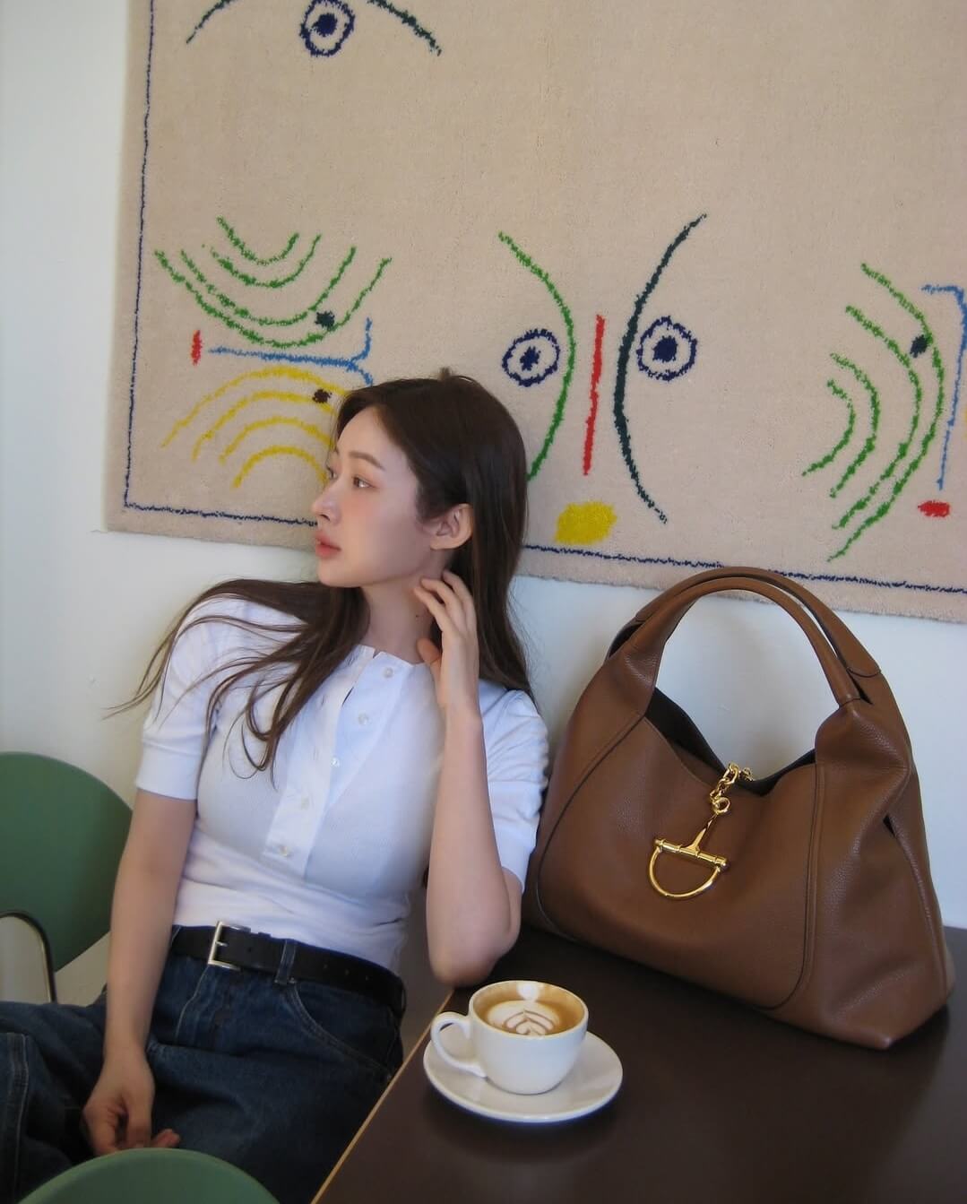 차정원은 인스타에서 베이직한 화이트 반팔 티셔츠, 루즈한 데님 팬츠와 함께 구찌 소프트빗 숄더백 브라운을 연출해주었습니다.