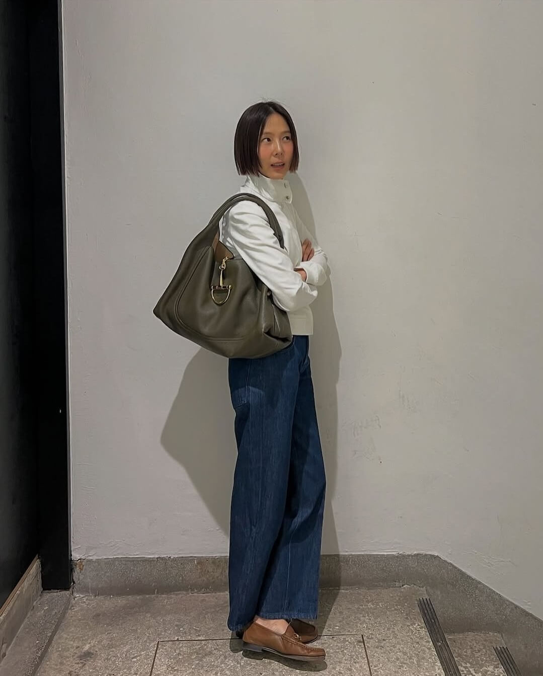 차정원과 비슷하게 화이트 집업 상의와 진청 와이드 데님 그리고 브라운 가죽 로퍼로 스타일리시한 룩을 선보였습니다.