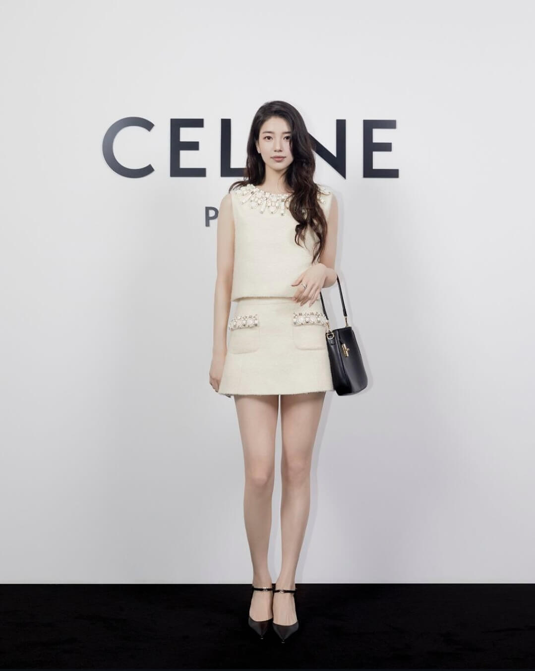 셀린느의 화이트 투피스와 까미유 백을 함께 코디하고 행사장에 등장한 수지의 모습입니다.