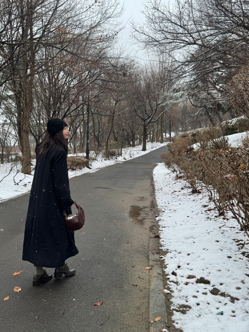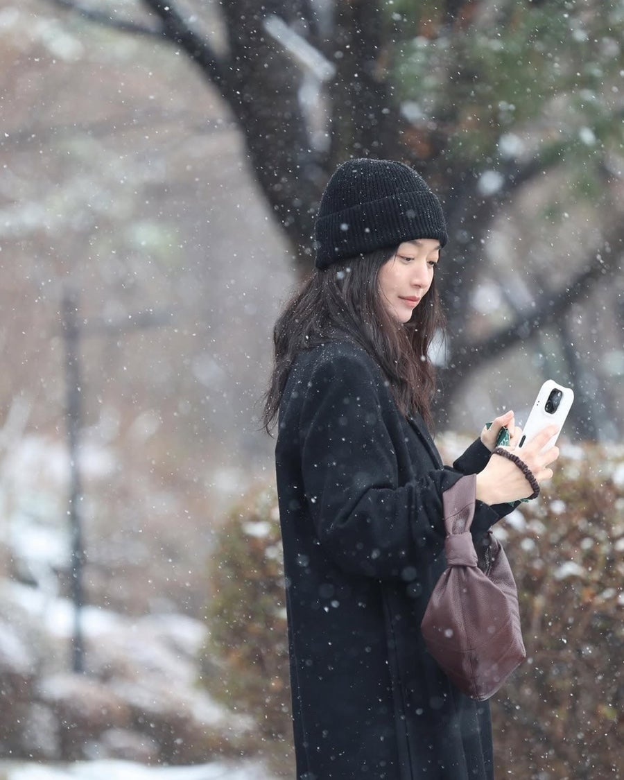 눈이 오는 날 검정 비니, 검정 롱코트, 검정 로퍼로 올블랙 착장을 보여준 신민아 님. 이와 함께 들고 있는 귀여운 가방도 주목을 받고 있습니다.