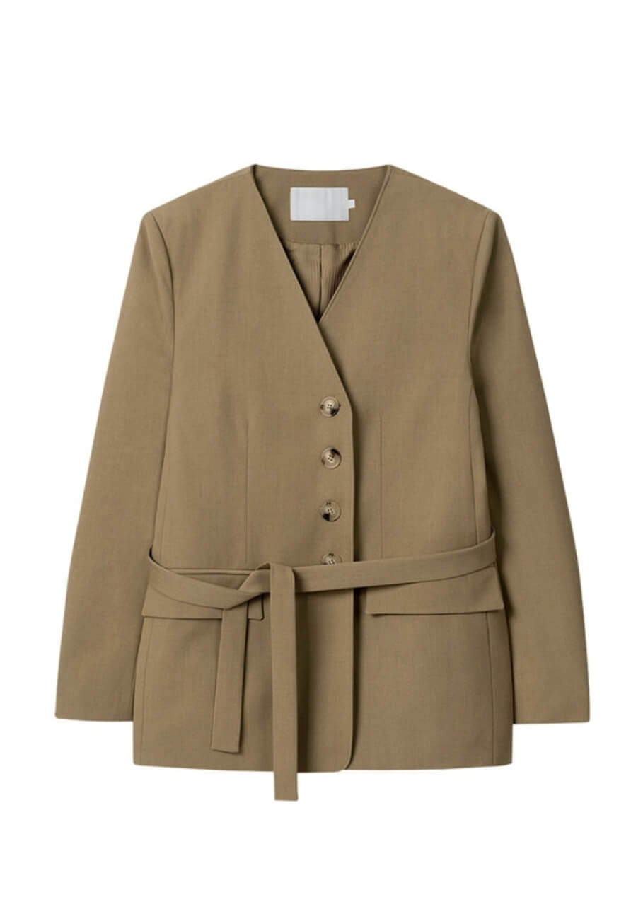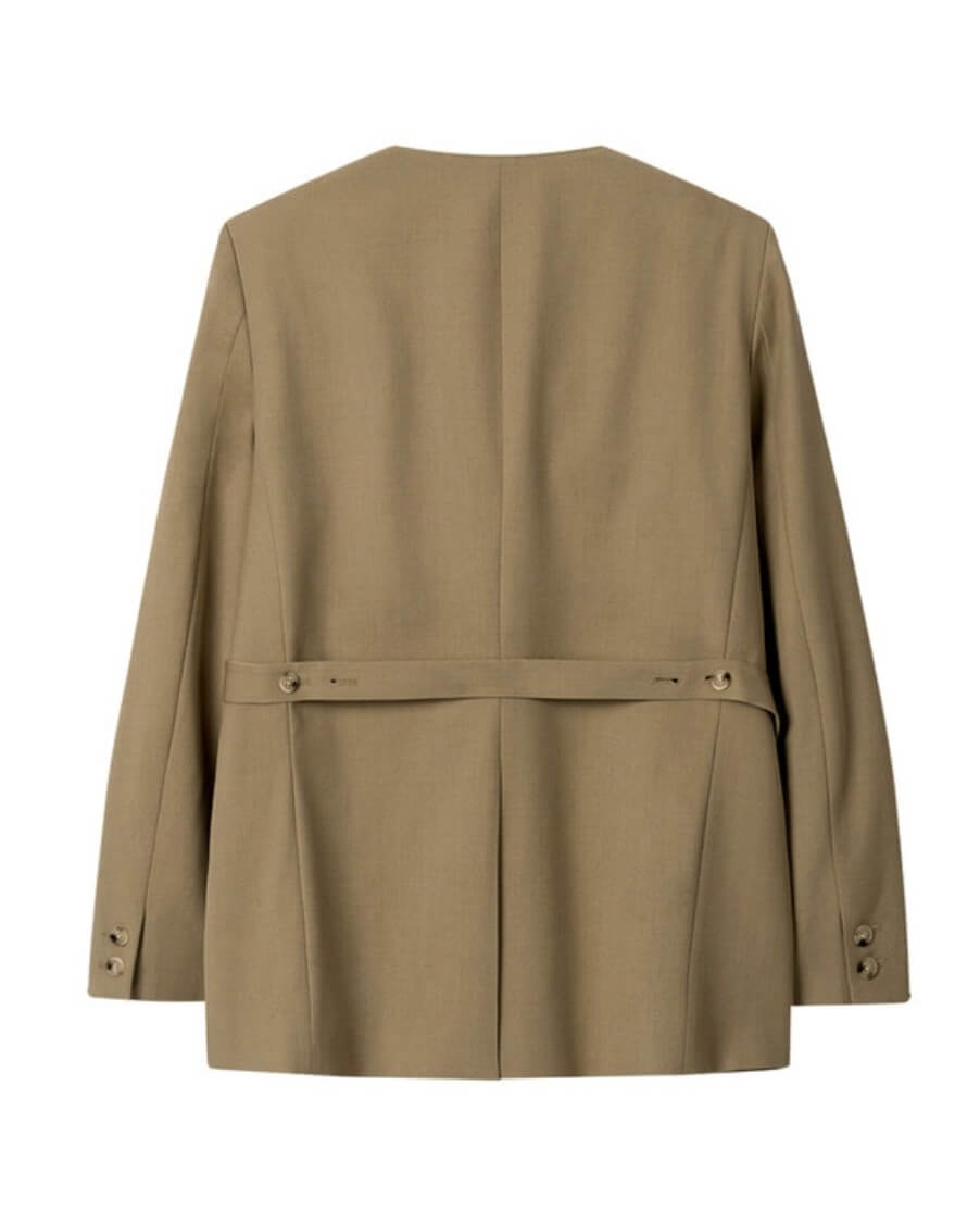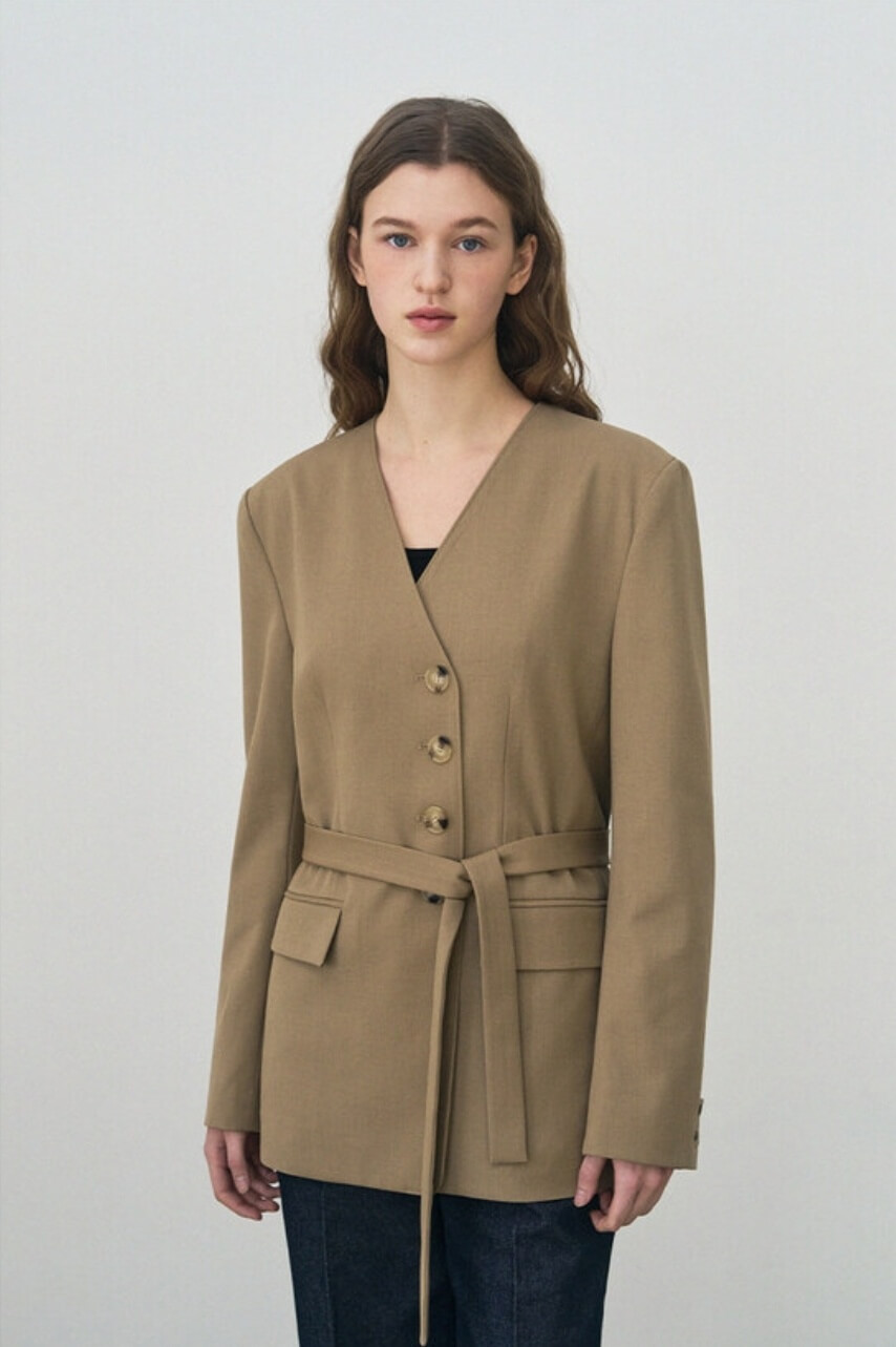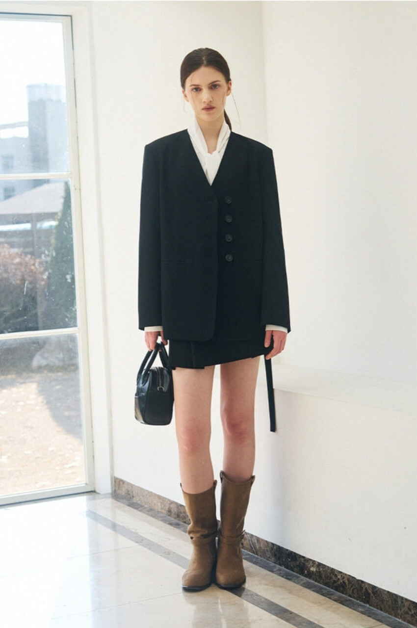 이 재킷은 스탠다드 핏감으로 칼라 없이 V넥으로 여성스러움을 강조한 블레이저입니다.