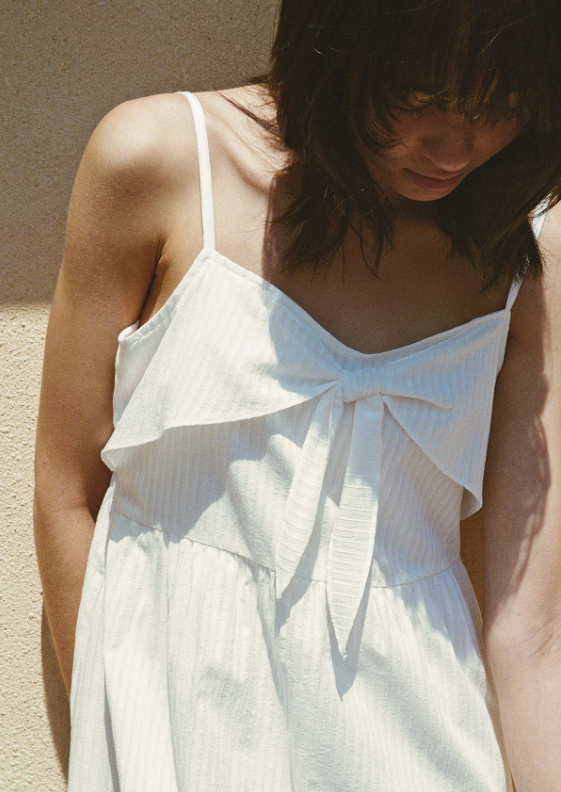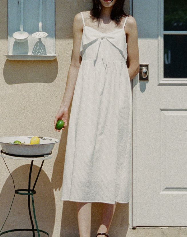 여름에 꼭 필요한 슬리브리스 원피스입니다. 앞뒤 가슴 부분에 날개처럼 펼쳐진 홑겹 패널 디테일은 리본처럼 묶어서 연출할 수 있습니다.