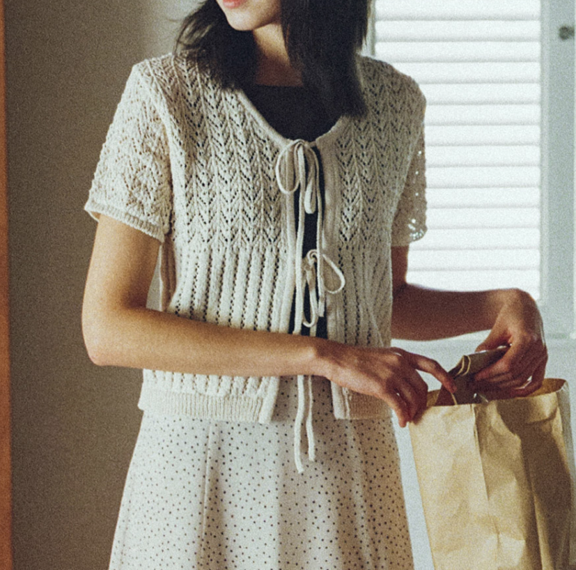 스트링 클로징 가디건이라 리본을 묶어서 연출하거나 아예 오픈해서 연출해도 괜찮은 니트 아이템입니다.