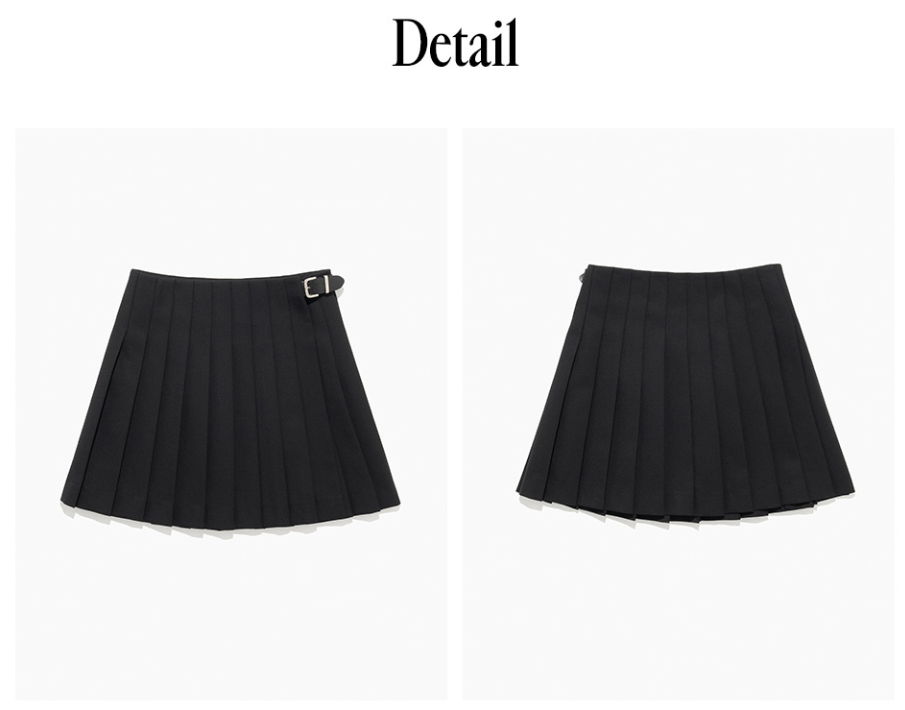 빈티지 무드의 텍스쳐로, 버클 스트랩 플리츠 스커트입니다.