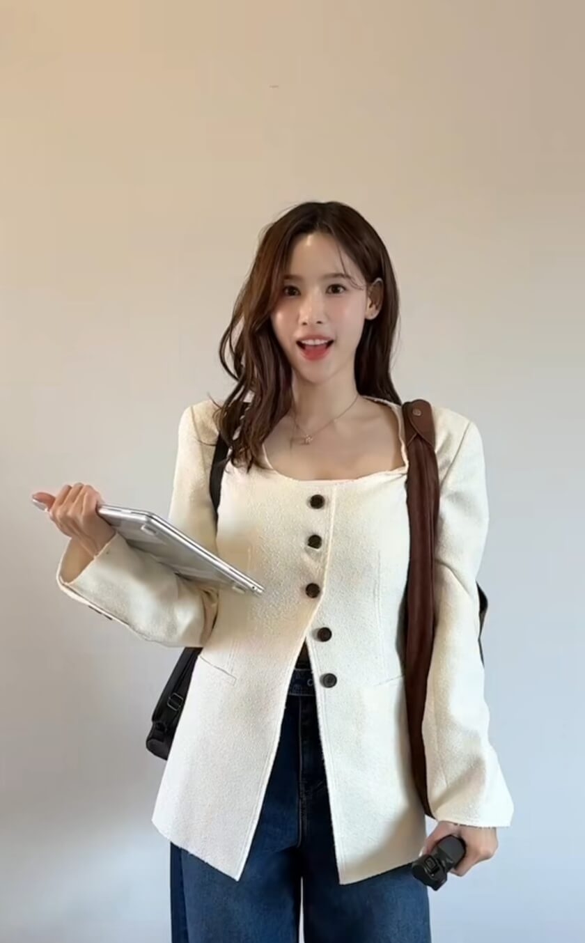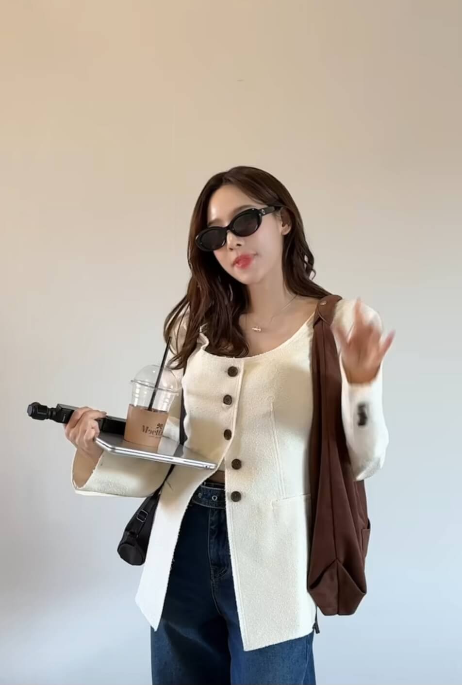 단추의 구성이 굉장히 유니크하게 보이는데 아래 두 단추를 채우지 않으면서 트임 효과를 줍니다.