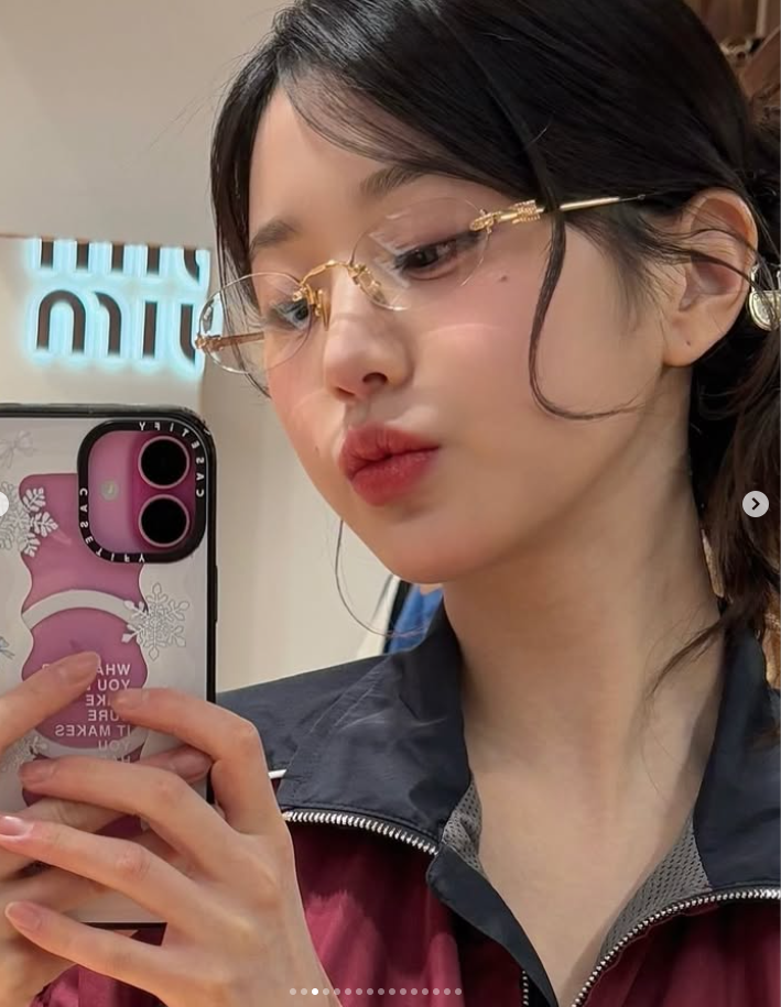 알이 작고 무테 안경이라 장원영의 예쁜 이목구비를 가리지 않으면서도 세련미가 느껴집니다.
