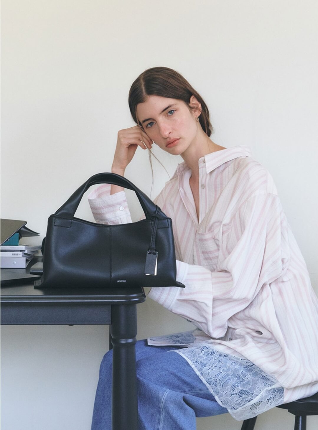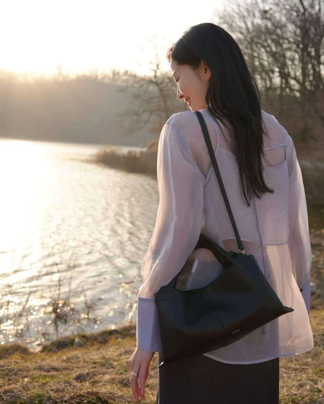 조이그라이슨의 오간자 블라우스와 함께 착용한 가방 제품도 마찬가지로 조이그라이슨 브랜드의 제품입니다.