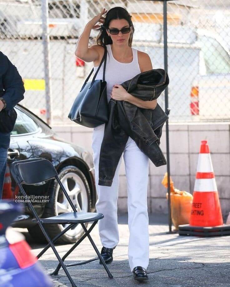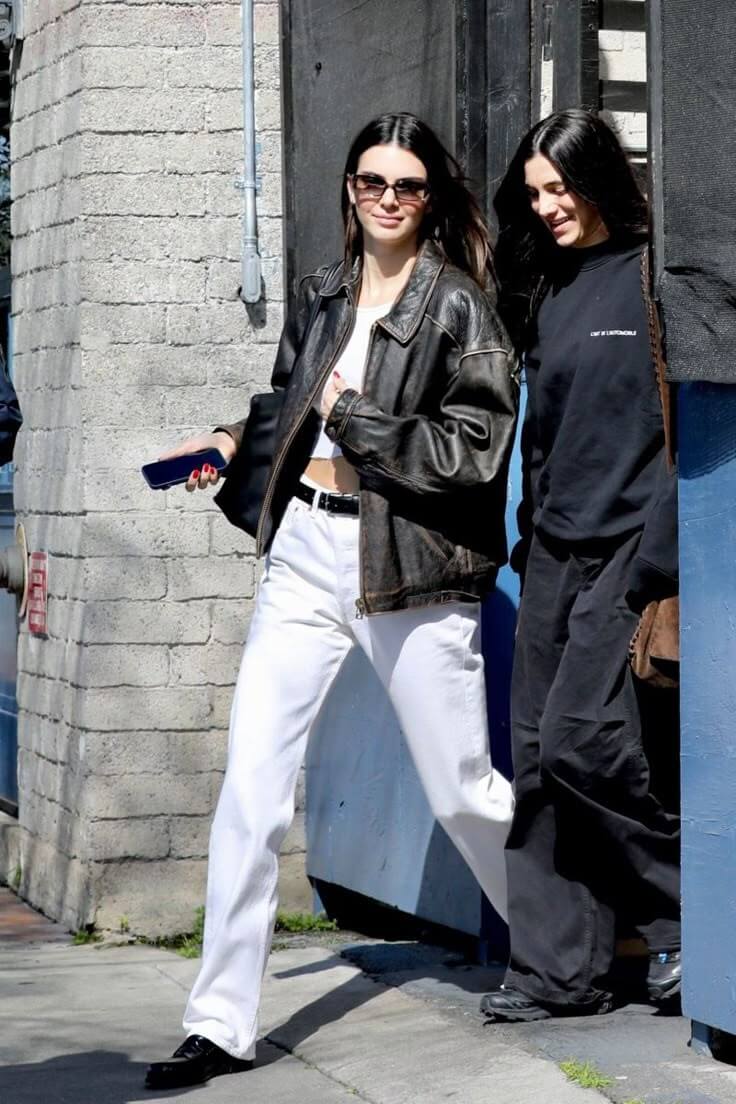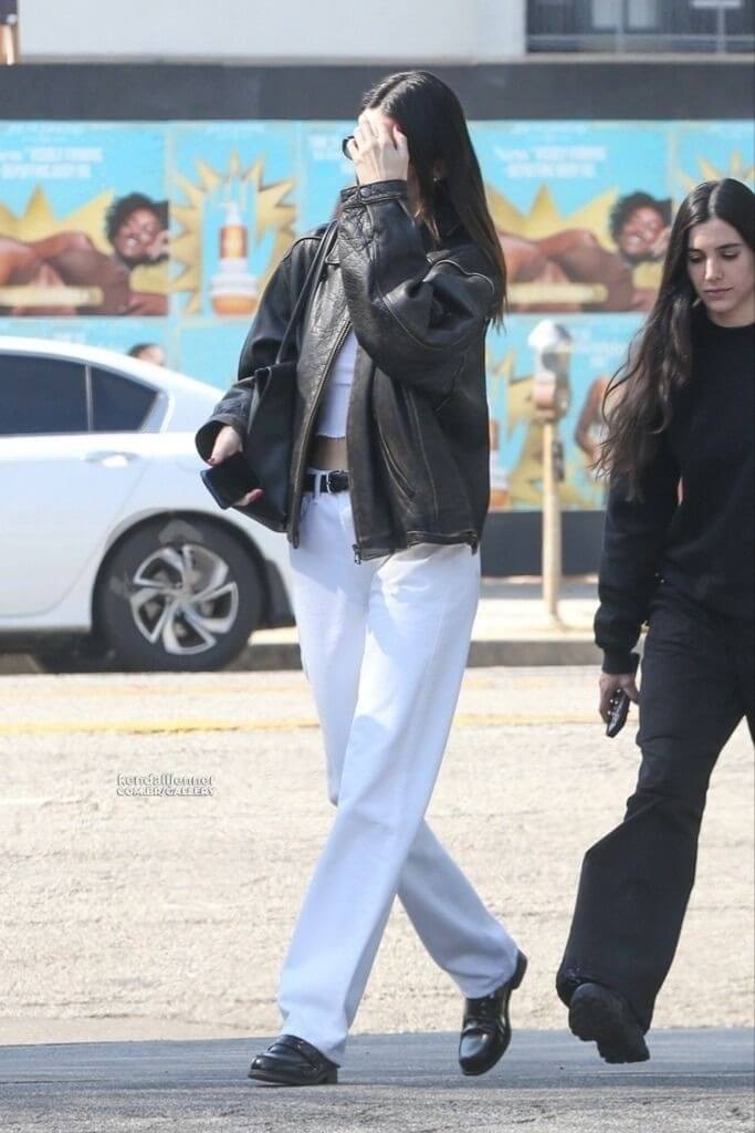 블랙 레더자켓과 화이트 팬츠로 깔끔하게 스타일링한 켄달 제너의 파파라치 사진입니다.