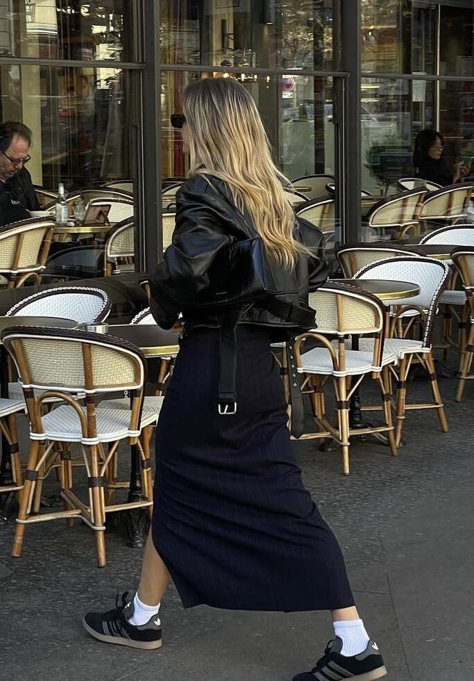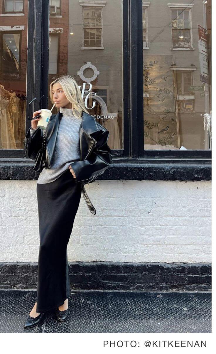 블랙 레더 자켓을 가장 시크하게 연출할 수 있는 코디는 블랙 롱 스커트와의 매치인 것 같습니다.