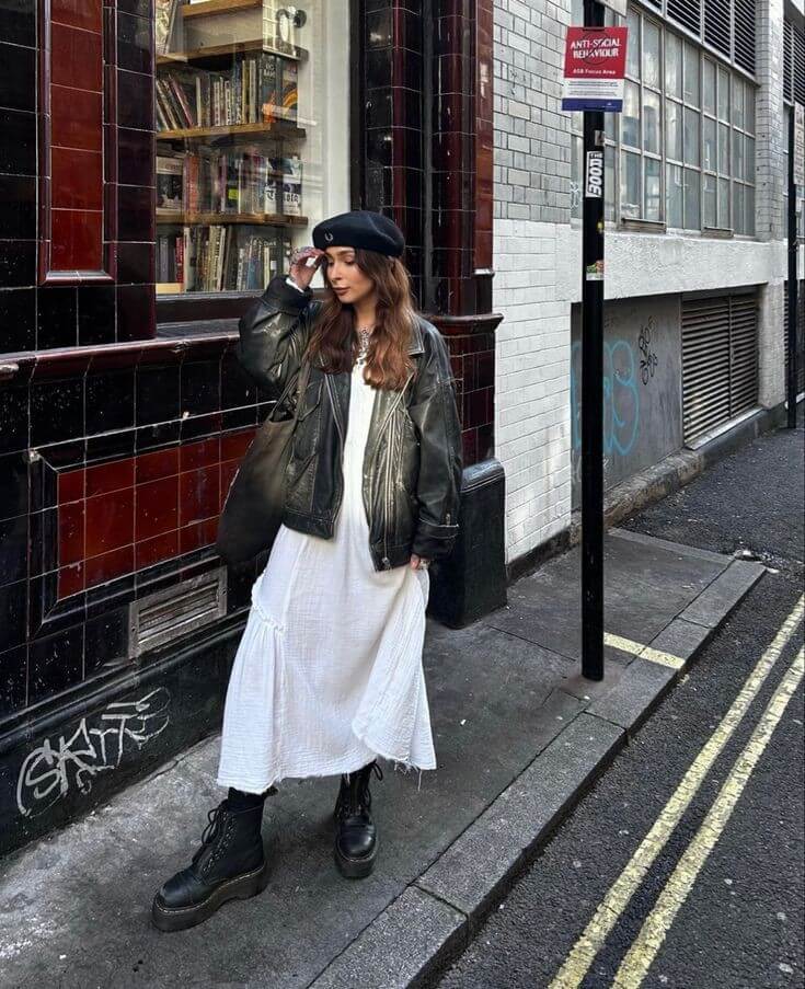 같은 화이트여도 다른 느낌을 주는 레더자켓과 화이트 드레스 코디입니다.