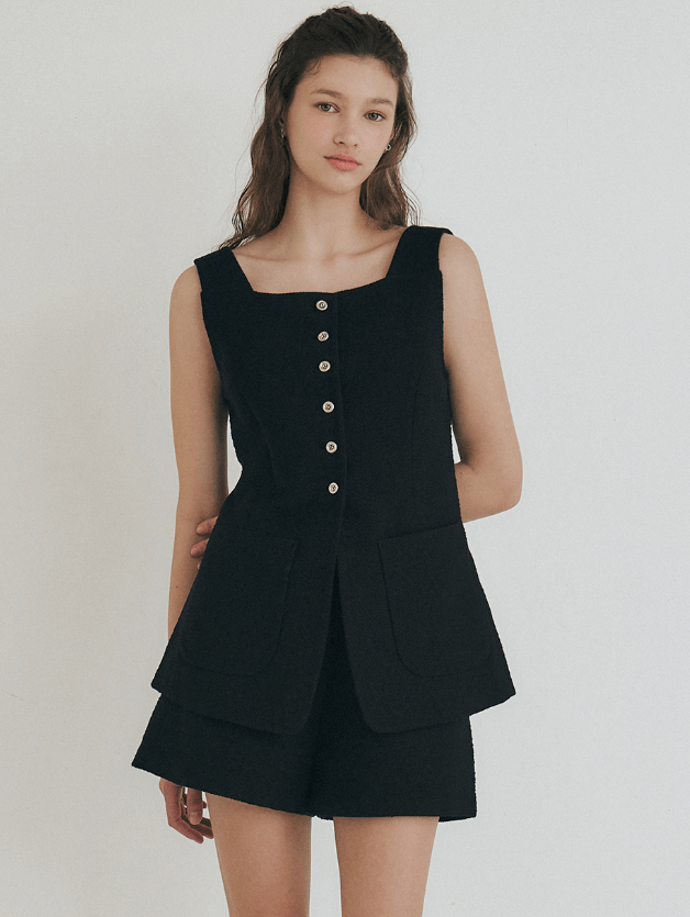 스커트, 바지, 원피스 등 어디에도 매치하기 좋은 블랙 자켓입니다. 디자인이 넥라인이나 단추, 쉐입이 유니크해서 구매욕이 올라옵니다.