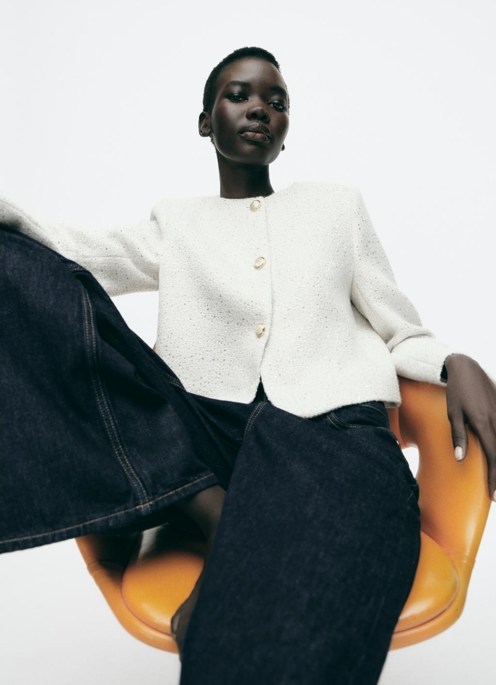 단순히 새하얀 컬러가 아니고 소재 자체에 디테일한 장식이 들어있어서 트위드 자켓 느낌을 줍니다.
