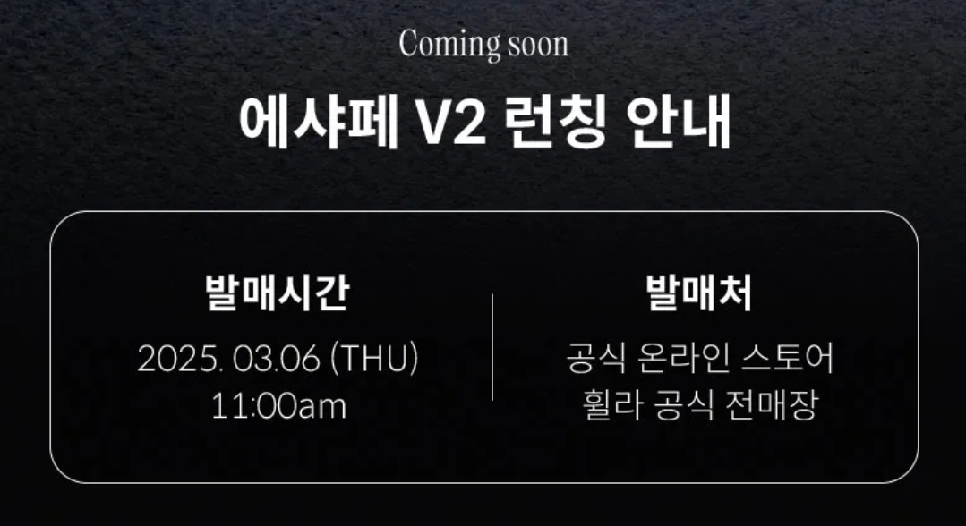 에샤페 V2는 2025년 3월 6일 오전 11시에 공식온라인 스토어 그리고 휠라 공식 전매장에서 발매한다고 합니다. 전 오전 11시에 컴퓨터 앞에 앉아있으려고 합니다.