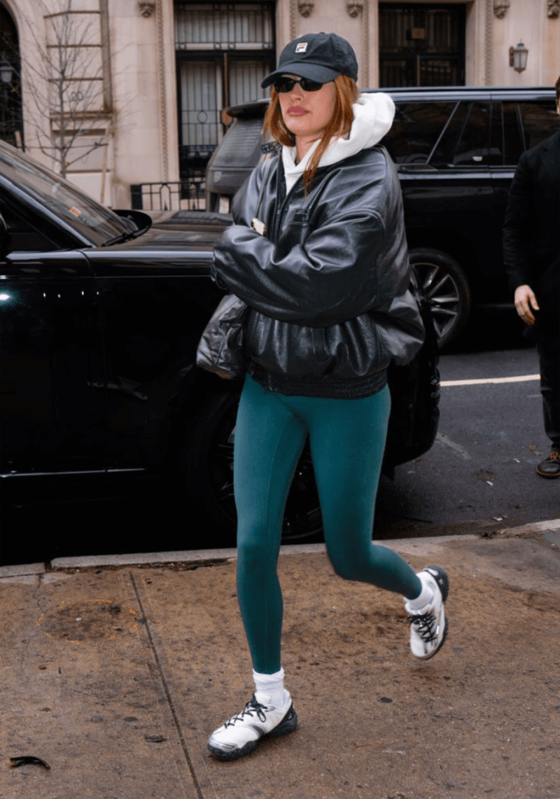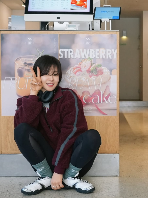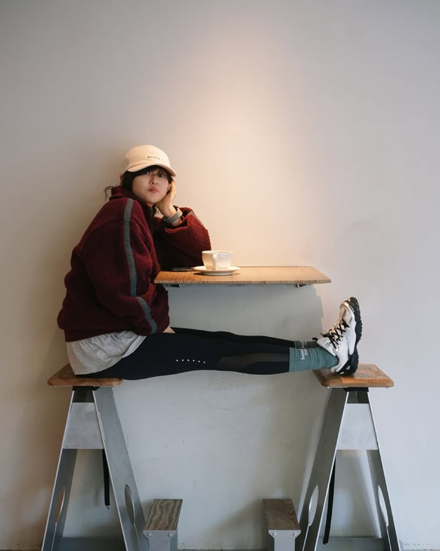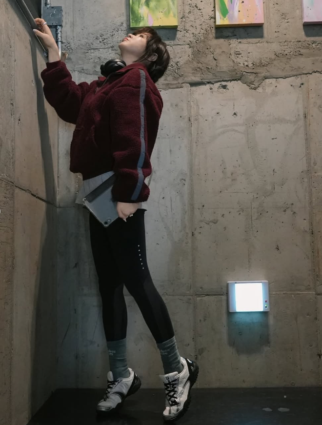 플리스 재킷, 레깅스로 캐주얼한 스타일의 옷을 입고 휠라 에샤페 V2를 함께 매치한 배우 최강희의 사진입니다.