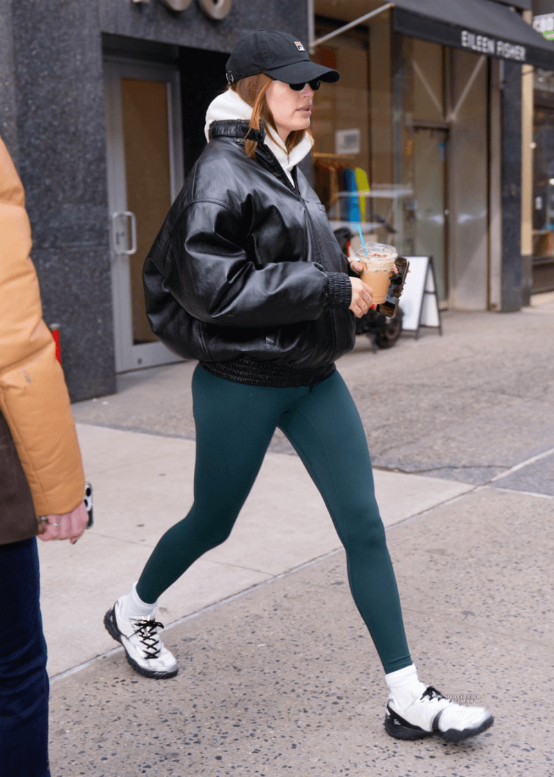플리스 재킷, 레깅스로 캐주얼한 스타일의 옷을 입고 휠라 에샤페 V2를 함께 매치한 배우 최강희의 사진입니다.