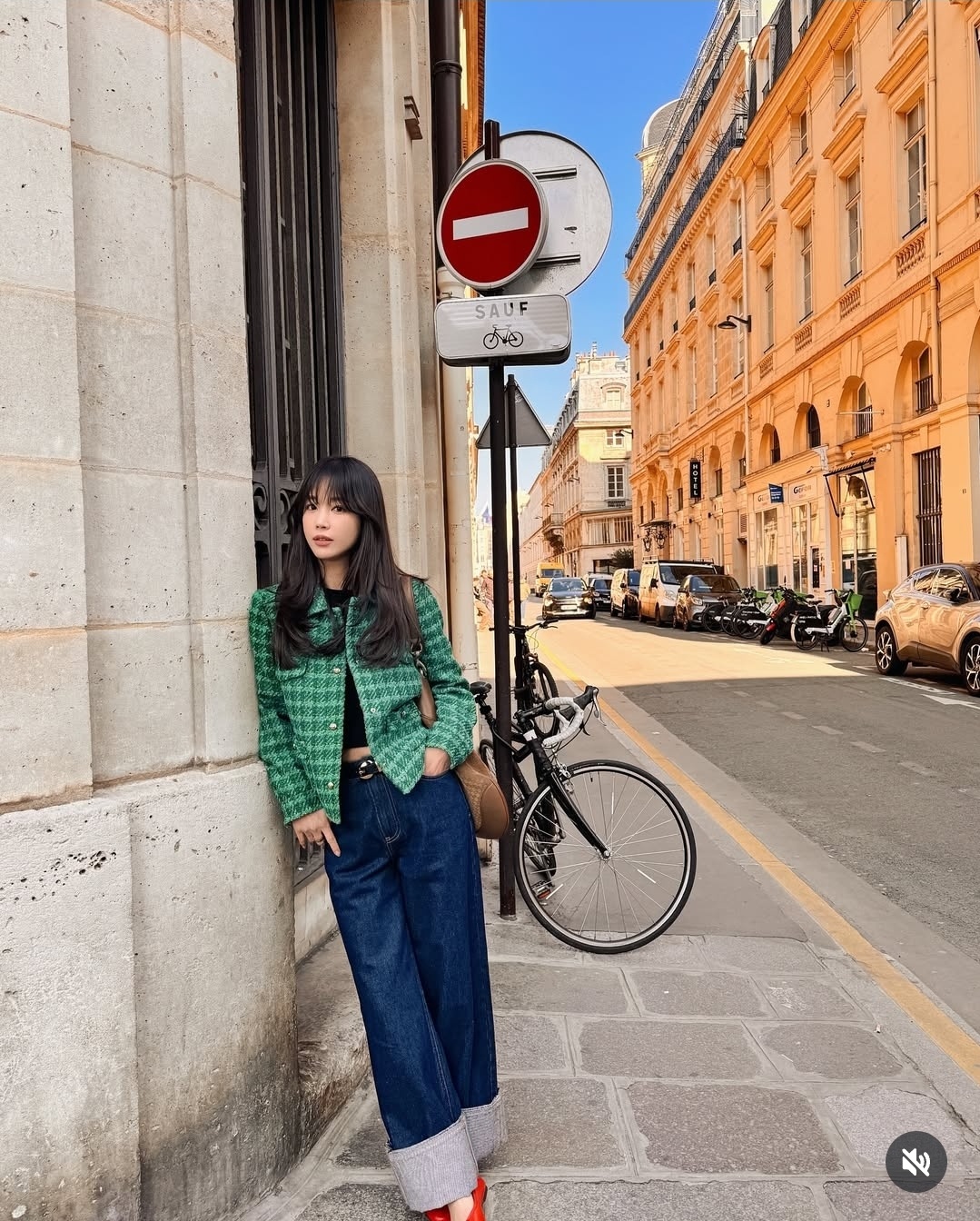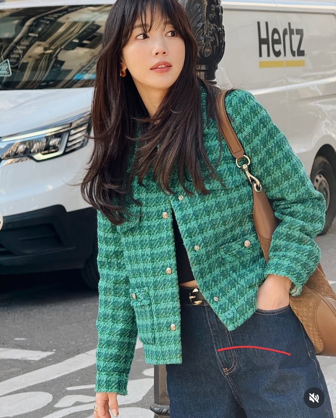 기은세는 편안한 와이드핏 청바지와 함께 매치했는데요, 트위드자켓을 포멀하게만 입을 수 있는 것이 아니라 데일리하게 연출할 수도 있다는 걸 보여주는 코디입니다.